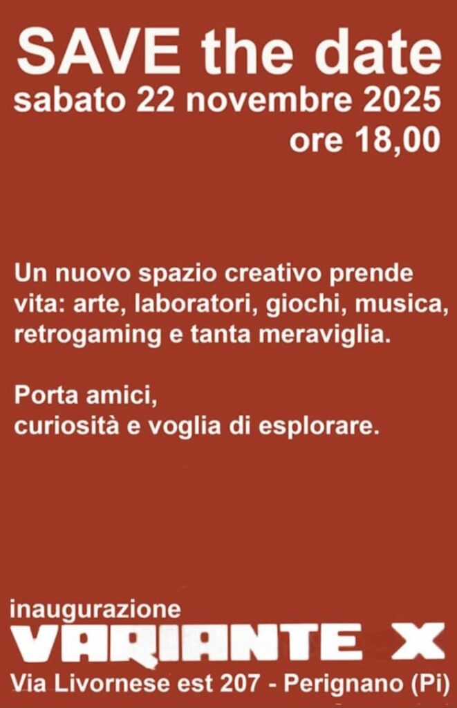 Saremo presenti con il nostro stand e le nostre attività all’inaugurazione di questo nuovo spazio creativo. Vi aspettiamo sabato 22 Novembre 2025 dalle ore 18 presso “VARIANTE X”Via Livornese Est 207, Perignano (PI)