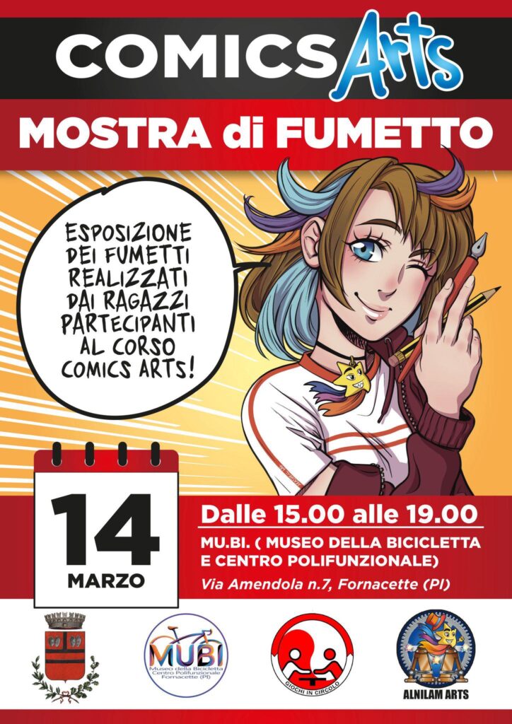 COMICS ARTS a cura della nostra Arashell! Il corso Torna a Fornacette! Ogni Mercoledì dalle 16:30 alle 18:30, al Circolo Operaio di Fornacette Richiesta la tessera Arci per partecipare. Il corso partirà al raggiungimento minimo di 10 partecipanti! Correte a iscrivervi! Tutte le info nella locandina qui sotto!